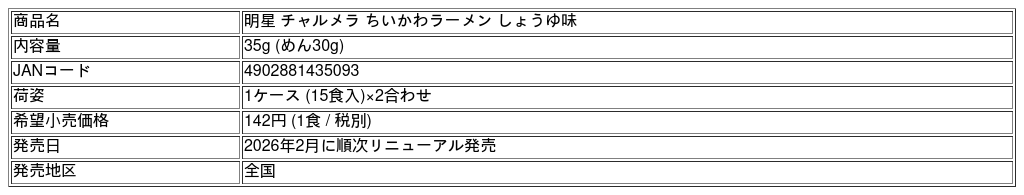 明星食品株式会社 (社長:豊留昭浩) は、ミニカップめん「明星 チャルメラ ちいかわラーメン しょうゆ味」を、2026年2月下旬に順次リニューアル発売します。