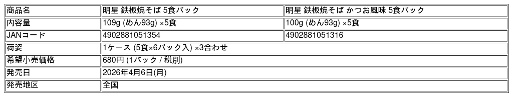 明星食品株式会社 (社長:豊留昭浩) は、袋めん「明星 鉄板焼そば 5食パック」「明星 鉄板焼そば かつお風味 5食パック」を、2026年4月6日(月) に全国でリニューアル発売します。