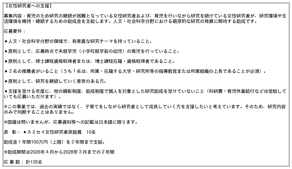 スミセイ女性研究者奨励賞