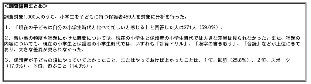 子どもの方が忙しいと回答した人にその理由を自由記述形式で尋ね、内容を分類したところ、最も多かったのは「習い事や学校が忙しい」(28.9%)、「宿題等やることや学ぶことが多い」(28.5%)、「特になし、なんとなく」(21.5%)と続きました。一方、保護者が忙しいと感じている理由の上位に挙がっていた「習い事の頻度」や「宿題にかけた時間」について、同調査内で、現在の小学生と保護者の小学生時代をそれぞれ尋ねたところ、大きな差異は見られませんでした。宿題の内容についても、保護者が小学生の時代と現在の小学生では、いずれも計算ドリルや漢字ドリル、音読などが上位に来ており、差は見られませんでした。