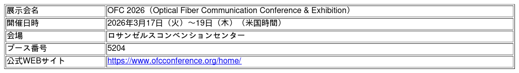 本開発品は、2026年3月17日(火)から19日(木)まで、米国カリフォルニア州ロサンゼルスで開催される光通信分野で世界最大級の国際展示会「OFC 2026」にて展示します。OFCは、光ファイバー通信技術に関する最新の研究開発成果や製品が発表される場として、世界中の通信事業者、データセンター事業者、研究機関から注目を集めています。会期中は、AuthenX社ブースにて本開発品を展示します。