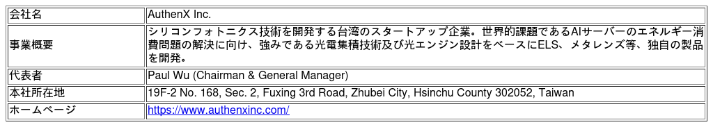 AuthenX社は、シリコンフォトニクス技術を活用した高速光トランシーバの設計・開発に強みを持つ台湾のスタートアップ企業です。