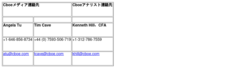 Cboe Global Marketsについて(Cboe:CBOE)は、エクイティ・デリバティブのイノベーションにおいて長い歴史を持つ、世界有数の市場運営会社です。Cboeは、1973年に世界初の上場オプション取引所を開設して以来、S&P500®指数オプションの導入や、市場のボラティリティを測る世界有数の指標であるVIX®指数の創設など、画期的な商品のパイオニアとして、投資家のリスク管理や機会へのアクセス方法を再構築してきました。現在、Cboeはデリバティブ、株式、FX市場を運営し、世界中の顧客に取引、清算、投資ソリューションを提供しています。詳しくはwww.cboe.comをご覧ください。