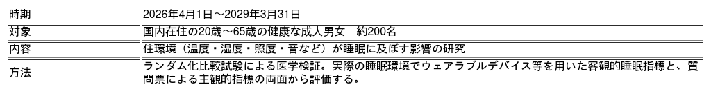 本研究では、約200名の成人を対象に、住環境が睡眠に及ぼす影響をランダム化比較試験(※1)で医学的に検証します。