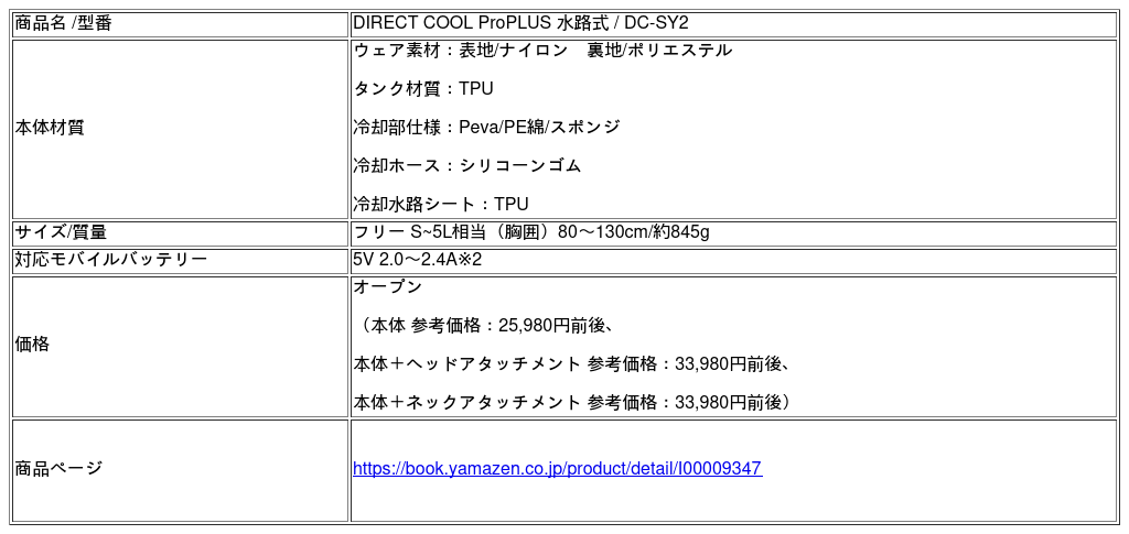 株式会社山善(本社:大阪市西区/代表取締役社長:岸田貢司)は、水冷服「DIRECT COOL」シリーズの新モデル「DIRECT COOL ProPLUS(ダイレクトクール プロプラス)水路式」を開発。本商品は、従来のチューブ式から背中を面で冷却する「水路式構造」へと進化し、より効率的かつ快適な冷却性能を実現しています。当社が運営するインターネット通販サイト「山善ビズコム」やECモール「くらしのeショップ」、並びに一部ホームセンターなどで、2026年5月中旬から順次発売いたします。また、水を入れて使用する気化熱冷却ベスト「Mizu fit」も今年3月末から発売中です。