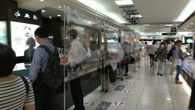 大丸京都店の地下1F。以前の賑わいが戻りつつありますが、入店時には検温チェック、アルコール消毒が設置されていて、行列が出来る所にはビニールシートが立ててありました。新しい生活様式に対応して安心してお買い物出来るように環境を整えて下さっています。