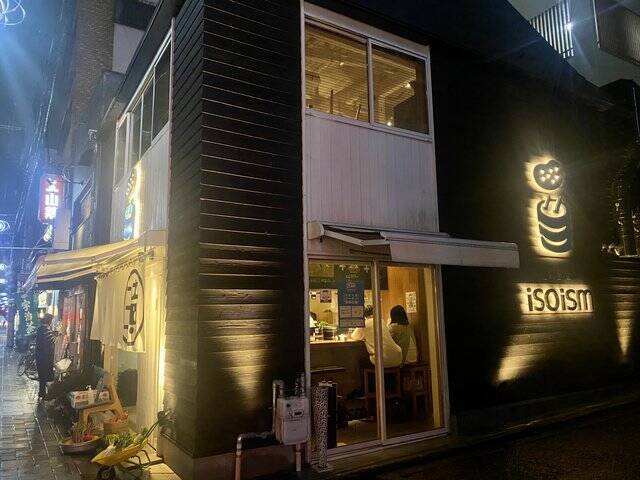 京都駅近く、七条通り沿いに、ぼやぁぁと光る「isoism」の看板。外からチラリと店内の楽しそうな雰囲気が見えます。