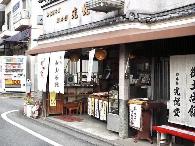 京都市北区の外れ、鷹峯の坂から大徳寺方面へ歩いて行く途中。見えてきたのが「名物 御土居餅」と書かれた白い暖簾。昭和42年創業の老舗和菓子屋「都本舗 光悦堂」です。