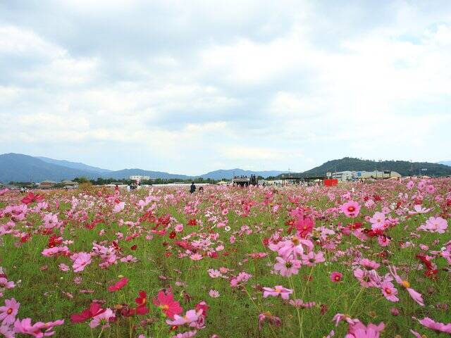 京都市に隣接する自然豊かな亀岡市。山を望む広大な園内で、20種800万本のコスモスが楽しめます。昨年の画像で園内の様子を紹介します。夢コスモス園へのアクセスは亀岡運動公園体育館のお隣で、お車の方は無料駐車場があります。