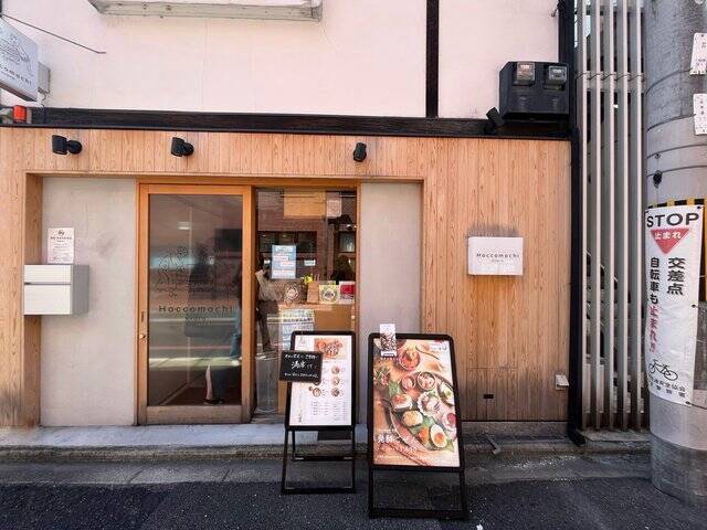 お店の場所は烏丸と河原町の間くらい、三条通りから柳馬場通りを南に入ってすぐ。温かみのある外観、店内入ってすぐは厨房になっており、2階がカフェになっています。テーブル席が5席ほど、この日も終日予約でいっぱいになっていました。