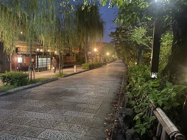 場所は祇園白川、ザ・京都を感じることのできる場所。夜は灯りもついてさらに雰囲気も増します。