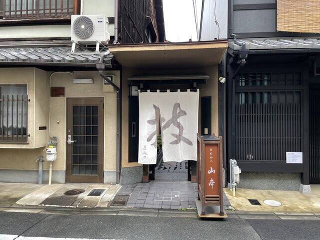寺町二条近く、路地に入ったところにある、とんかつの名店「山本」隠れ家のような佇まいで初見だと、注意しないと見逃してみまうほど。この暖簾が目印。