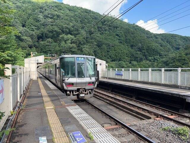 まずはJR保津峡駅に到着。保津峡の上、谷底には大堰川が流れ、高所恐怖症の人ならチビりそうな立地に駅があります(笑)映画『蒲田行進曲』のロケ地でもあり。
