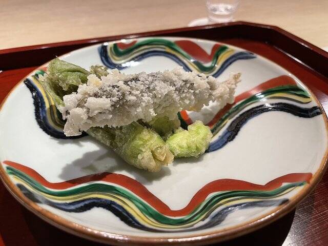 衣の食感がおもしろい小鮎の天ぷらと、薄衣の山菜はの絶妙な苦みから春を感じます。