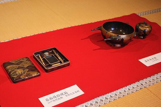 左・扇面蒔絵硯箱、右・漆塗角水盥