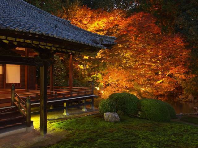 京都市の名勝に指定されている庭園は、約2万平方メートルもの広さがあり、紅葉をはじめ、四季折々の自然美が自慢です。書院前には、水戸光圀寄進したと言われる、ユニークな形をした「勧修寺型灯籠」もあります。