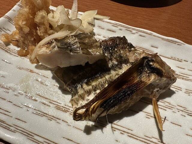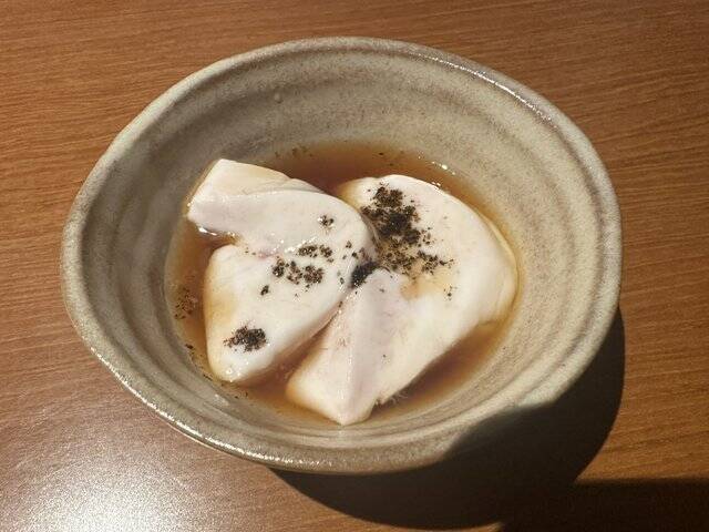 1品目は、ボラの白子ぽん酢。ねっとり濃厚な白子にさっぱりしたぽん酢。風味豊かで優しい辛さの黒七味がいいアクセントに。1品目からお酒にあう、よきスターターです。