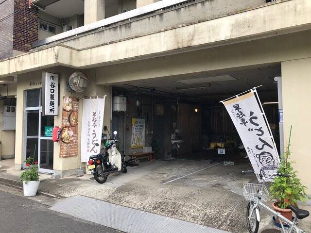 店舗は製麺所の工場敷地内に併設され、入口に駐車場とテラス席。さらに奥にはビニールシートが張られたテーブル席スペースがあります。