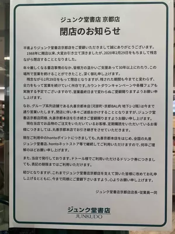 「【閉店】京都を代表する大型書店「ジュンク堂書店 京都店」が2月末閉店へ…」の画像