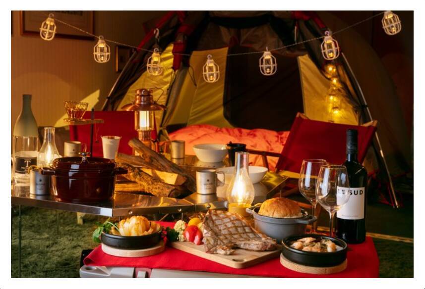 客室内には人気のアウトドアブランド「snow peak」のグランピングセットを完備。デザイン性の高いテントや囲炉裏テーブルで、ルームサービスの朝食(ミックスフィンガーサンドイッチ・サラダ・コーヒーまたは紅茶)を楽しめます。