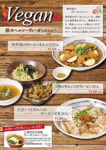 つけ麺タイプの「三種の旬キノコ天ヴィーガンうどん」(税抜1,250円)、旨みが凝縮したあんかけをかけた「秋野菜のヴィーガンあんかけうどん」(税抜1,350円)、大豆ミートの挽肉とまろやかな豆乳を合わせた「大豆ミートと旬キノコのヴィーガン豆乳うどん」(税抜1,380円)のラインナップです。