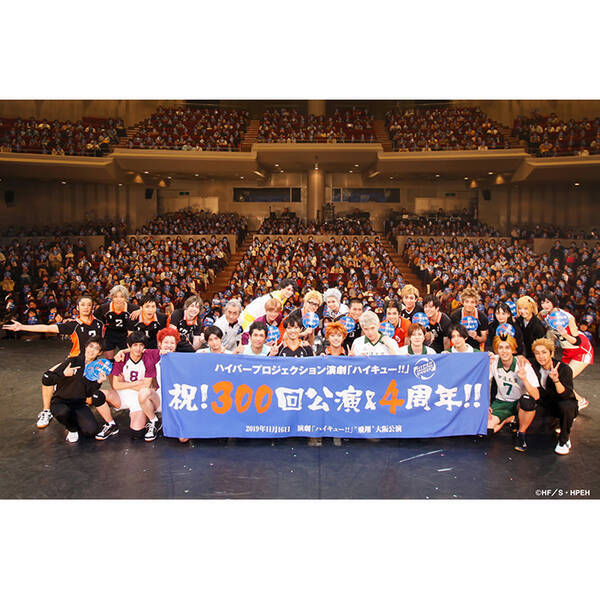 ハイパープロジェクション演劇「ハイキュー!!」は2015年11月14日に初演の幕を上げ、そこから2016年4月の再演“頂の景色”、同年10月の“烏野、復活!”、2017年3月の“勝者と敗者”、同年9月の“進化の夏”、2018年4月“はじまりの巨人”、同年10月の“最強の”、そして本年4月“東京の陣”と公演を重ね、現在上演中の“飛翔”大阪公演中に4周年を、さらに11月16日13時公演にて通算300回を迎えた。