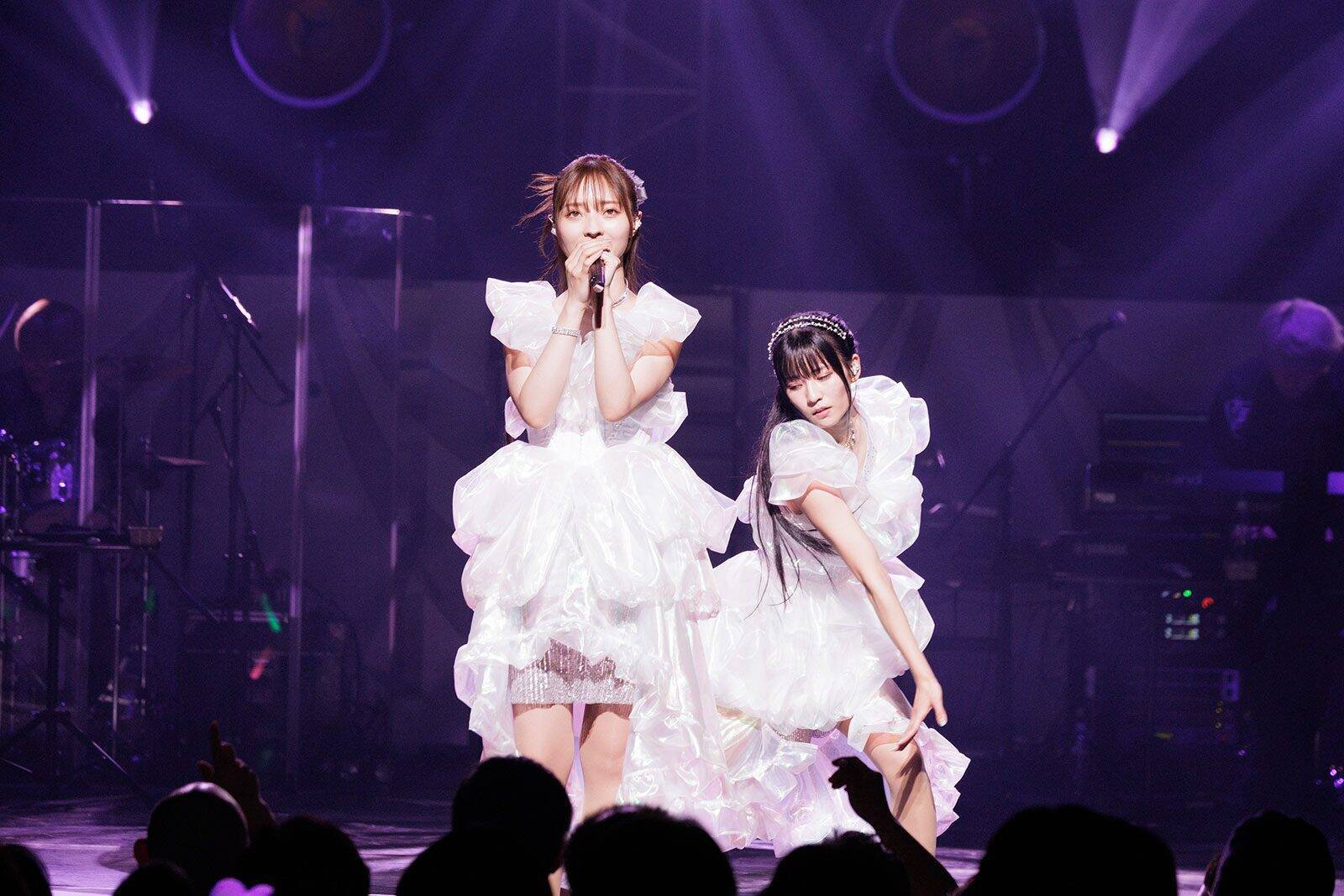 その後、お着替えタイムを兼ねた2人のソロMCでは(一方が着替えている間にもう一方がMCを担当した)、カレンがクララの居ぬ間に彼女の面白エピソード(同日の昼公演のあと、生クリームたっぷりのフルーツサンドを食べようとしたクララが、フルーツを落としてしまった話など)を話して、クララが慌ててステージに戻ってくる一幕も。そして白ベースの光沢のあるドレス衣装に着替えた2人は、ここからニューアルバム『Iris』の新曲を一気に畳みかける。まずはチルなムードの柔らかなエレクトロポップ「Wonder Night」。ふわふわと漂うようなユニゾンボイスで無重力のワンダーナイトへと誘う。