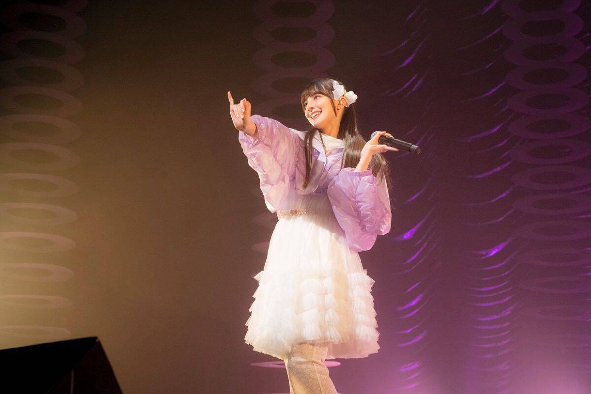 1曲目は自身の1stシングルの表題曲でもある「魔法」。聞く人の背中を押す前向きな歌詞の様に、『共に行こうよ 夢見たあの場所まで』と真っすぐに歌い、会場に集まった”浪漫派(ファンネーム)”へ手を伸ばす姿は、可愛さの中に、会場全体を先導する”逞しさ”をも感じさせた。続いて披露した「キミが手を握ってくれるのなら」では、前曲「魔法」で差し伸べた手をファンと取り合うかの様なストーリーに、ぐっと引き込まれる。