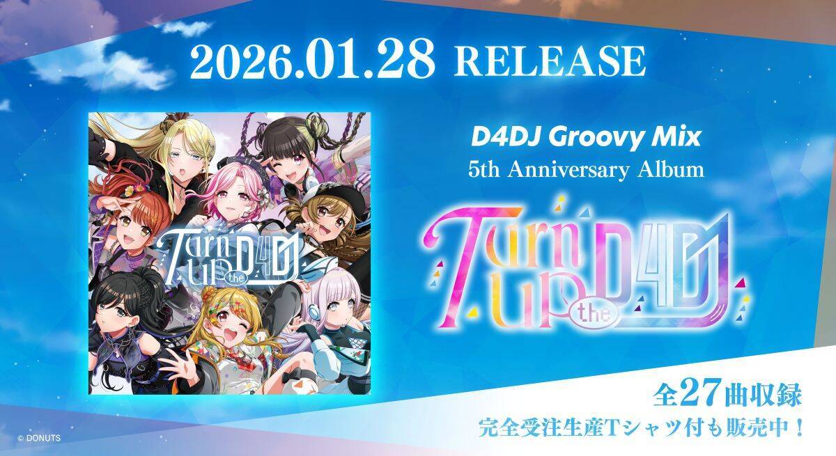 また、グルミク5周年を記念したフルアルバム『Turn UP the D4DJ』がD4DJ OFFICIAL ONLINE STOREからリリース決定!2024年6月にゲームリリースされた「Bloody Mary」から「天使が来りて笛を吹く」まで、ゲームを彩った楽曲をセレクト。さらに、初公開となるRemix楽曲を収録&ジャケットデザインを使用したアクリルスタンドが付属。完全受注生産限定盤として、ここでしか手に入らない“にょちおTシャツ”がセットになったスペシャル仕様も用意されている。こちらはD4DJ OFFICIAL ONLINE STOREにて予約受付中。