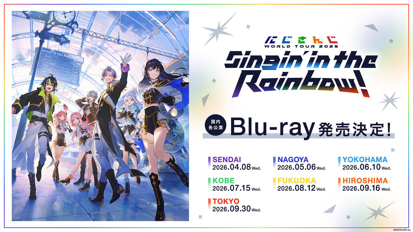 バーチャルライバーグループ・にじさんじが7周年を記念し、2025年5月10日から2026年1月18日にわたり開催したライブツアー“にじさんじ WORLD TOUR 2025 Singin’ in the Rainbow!”の仙台、名古屋、横浜、神戸、福岡、広島、東京の7公演をBlu-ray化し、2026年4月8日(水)から順次販売されることが発表された。
