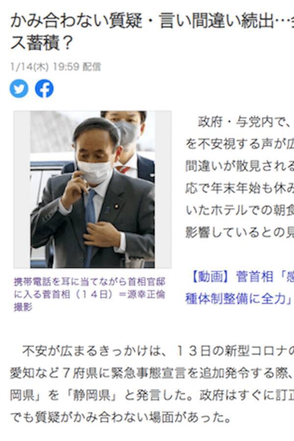 〈政府・与党内で、菅首相の疲労とストレスの蓄積を不安視する声が広がっている。重要案件での言い間違いが散見されるためだ。新型コロナウイルス対応で年末年始も休みなく公務をこなし、日課としていたホテルでの朝食も自粛を強いられていることが影響しているとの見方が出ている。〉