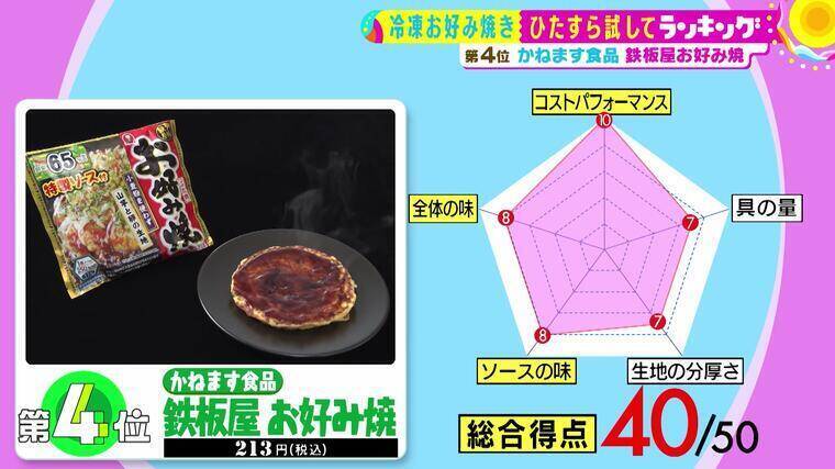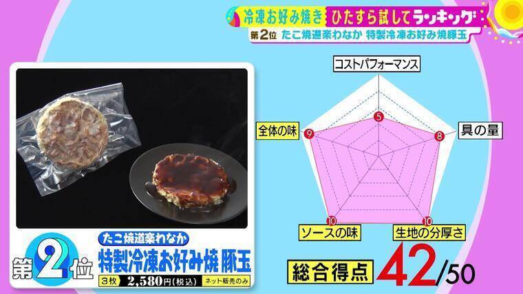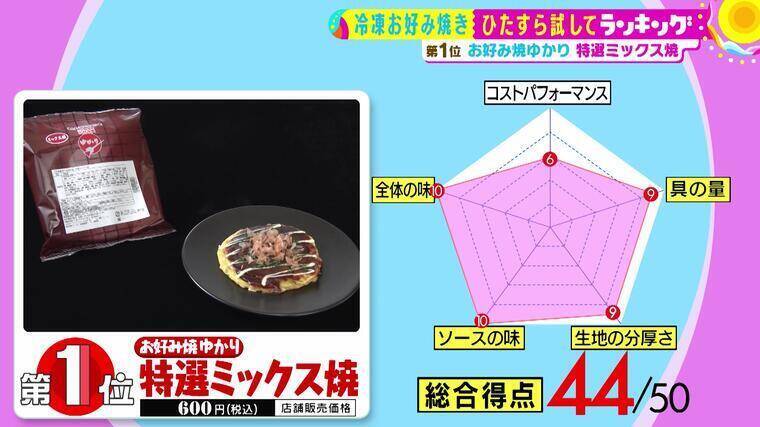 大阪のお好み焼きの老舗「ゆかり」の冷凍お好み焼きが、「ソースの味」「全体の味」で堂々の2冠を達成し、圧倒的な美味しさで1位となった。具材には熱すると甘くなる専用のキャベツを使用し、鶏がらスープや長芋を加えた店と同じミックス粉により、生地は風味豊かでふわふわサクサクの食感に。