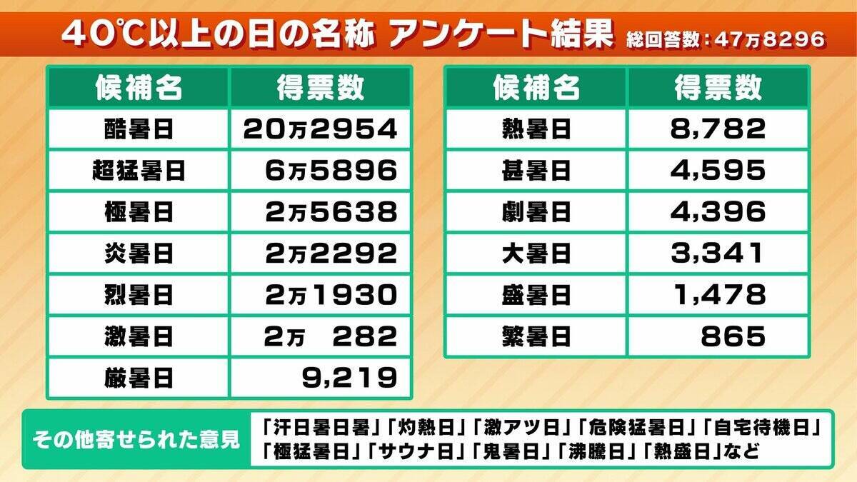 今回決定した「酷暑日」をはじめ、「超猛暑日」や「極暑日」、「激暑日」など、13の案の中から1つを選んで投票する形で、「酷暑日」は総回答数の4割以上にあたる約20万票の支持を集めました。