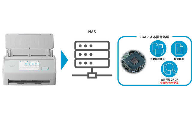 iX2500では、次世代SoC「iiGA」の処理により、ネットワークフォルダーに保存する際にも、向き補正や縦筋軽減といった画像処理が利用できるそうです。