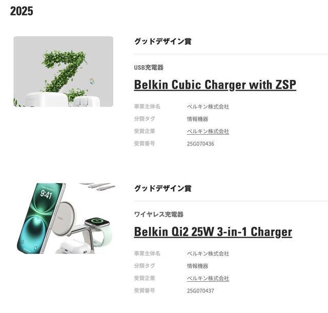 ベルキンが「Belkin UltraCharge Pro 3-in-1」「Belkin Cubic Charger 67W」「Belkin Cubic Charger 50W」に関して「2025年度グッドデザイン賞」を受賞したと発表しています。