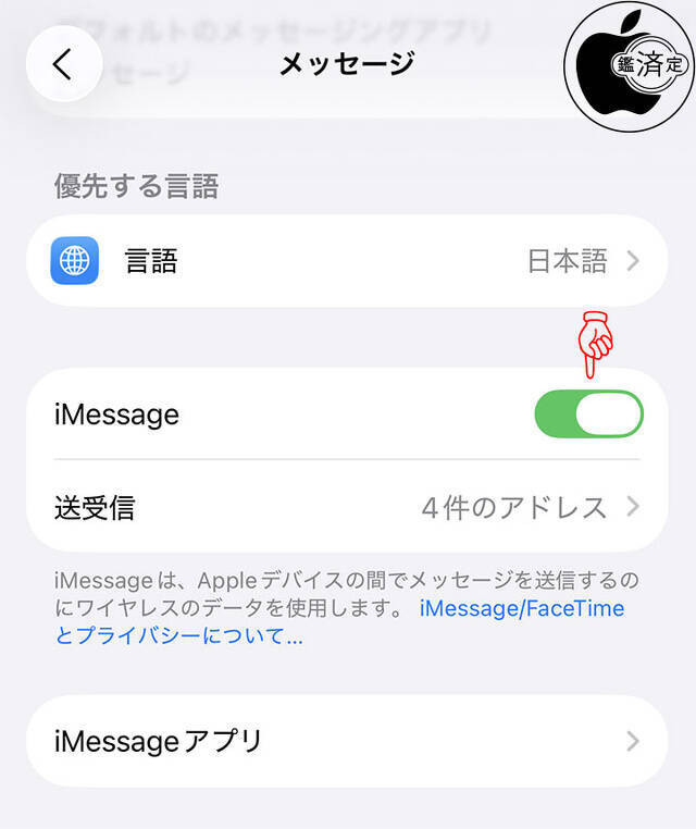 このような症状の場合、設定>アプリ>メッセージで「iMessage」のボタンを一度オフにしてから再度オンにすると説明しています。