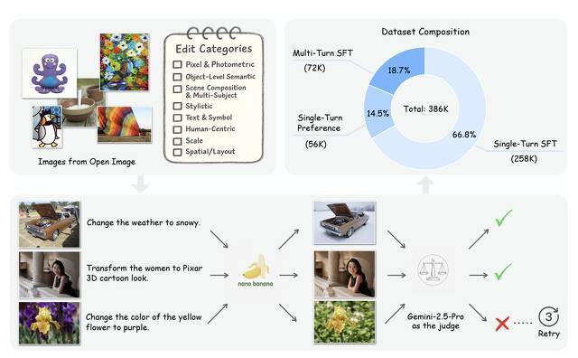 Googleの世界最大の画像データセットOpen Imagesから取得したSFT用シングルターンテキスト-画像-編集トリプレット約257,000件、選好学習用シングルターンテキスト-画像(肯定的)-画像(否定的)-編集約56,000件、マルチターン応用向けマルチターンテキスト-画像-編集約72,000件を学習させています。