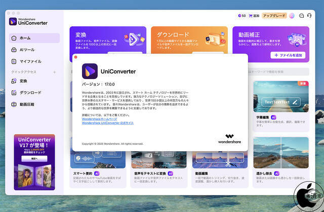 Wondershareが、動画変換ソフトウェア「[Wondershare UniConverter 17 for Mac](https://wondersharesoftware.pxf.io/c/1333996/1348175/15586)」をリリースしています。アップグレード版オールインワンAIメディアツールキットを体験—より速く、賢く、そしてクリエイティブにします。