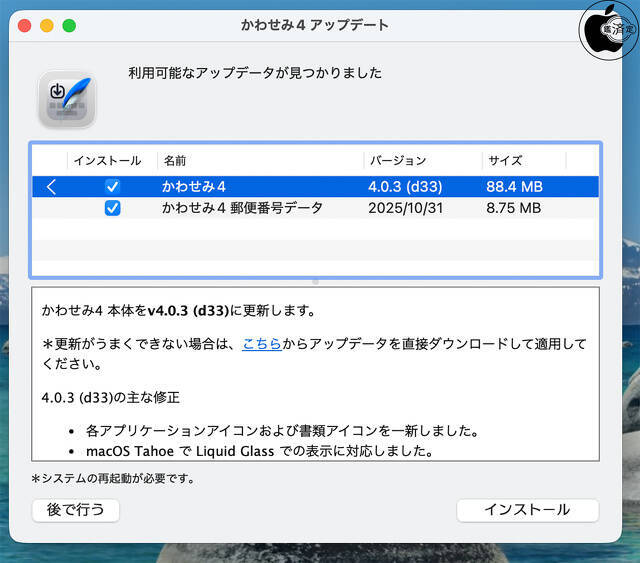 物書堂が、macOS用日本語入力プログラム「[かわせみ4](https://www.monokakido.jp/ja/mac/kawasemi4/)」をmacOS Sequoiaに対応させるためのアップデーター「[かわせみ4(v4.0.3)](https://www.monokakido.jp/ja/news_release/2025/kawasemi4-v403.html)」の配布を開始しています。macOS Ventura以降、Intel および Apple シリコン搭載Macに対応しています。