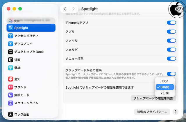 このクリップボードの履歴は、設定>Spotlight「クリップボード検索」としてオン/オフ設定が用意されていましたが、macOS Tahoe 26.1以降は「クリップボードからの結果」と表記が変わり、加えて「Spotlightでクリップボードの履歴を使用できます」として、保持時間が、従来の「8時間」に加えて「30分」「7日間」が選べるようになっています。