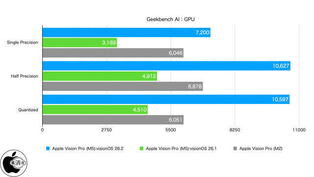 AIベンチマークアプリ「Geekbench AI」を使用して、GPUベンチマーク計測を行った場合、visionOS 26.1まではApple Vision Pro(M2) のM2チップを下回る計測値となっていましたが、visionOS 26.2アップデートで改善され、M5チップのGPUに搭載されたNeural Accelerators利用時の最適化が行われたためか、Apple Vision Pro(M2) のM2チップと比較して最大約1.75倍の性能差が出るようになっています。