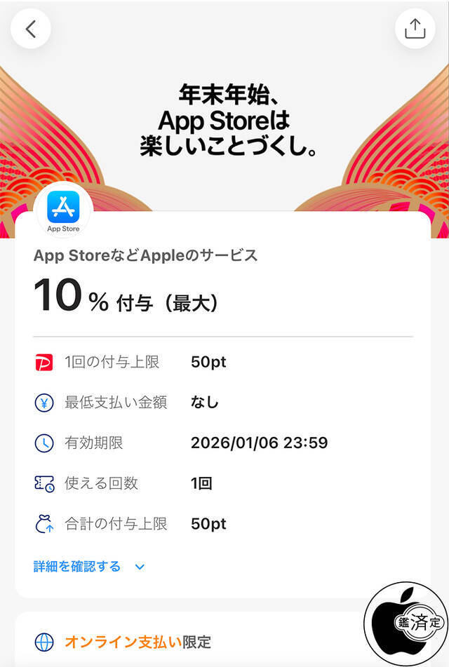 PayPayが、App StoreなどAppleのサービスの支払いをされる方限定で最大10%付与の「クーポン」(PayPayアプリが必要)を配布しています。