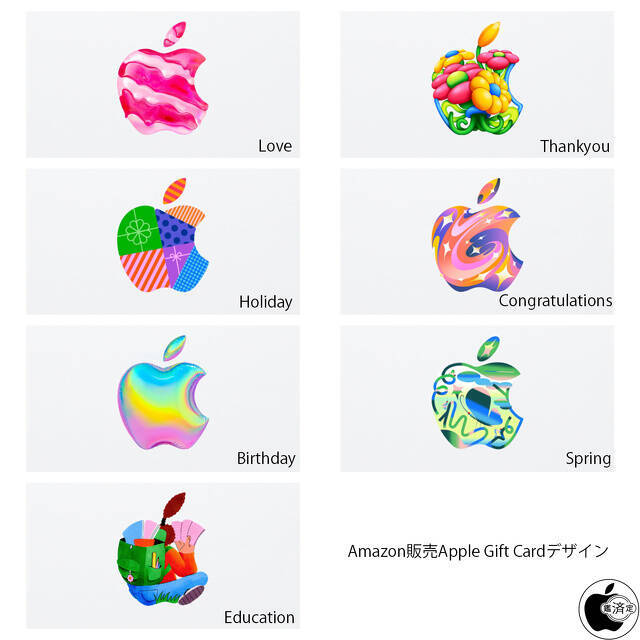 Amazon.co.jpが、iPad、AirPods、Apple Watch、iPhone、MacBook、iCloudのストレージ、アクセサリなど、すべてのApple製品の購入使える「Apple Gift Card」に新しい7種類のデザインを追加して販売しています。