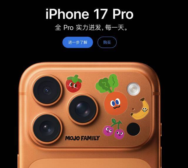 中国Appleが、iPhone 17 ProコズミックオレンジモデルのプラトーにMOJO FAMILYシール「STAYREAL MOJO FAMILY趣貼貼貼紙」を貼ったヒーロー画像「MOJO FAMILY痛版」を掲示しています。