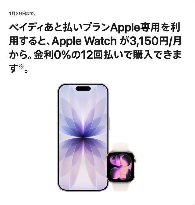 Appleが、ペイディあと払いプランApple専用を利用すると、Apple Watchを金利0%の12回払いで購入出来る「[Apple Watch 12か月分割払いプラン](https://apple.sjv.io/9gqddj)」キャンペーンを実施しています。Appleの下取りをペイディあと払いプランApple専用と同時に利用すると、Apple Watchをさらにお得に購入できます。