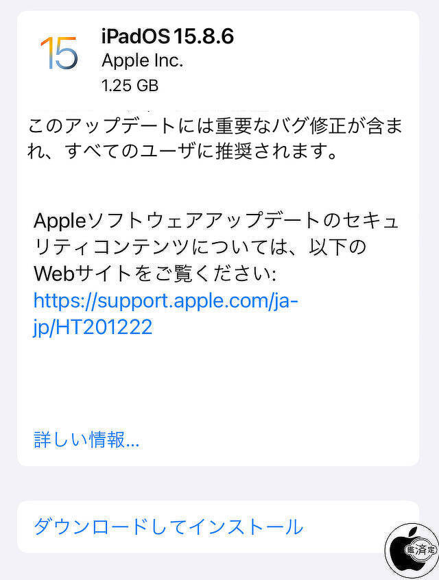 Appleが、iTunes経由または、iOSデバイスのソフトウェア・アップデート経由で「[iPadOS 15.8.6 ソフトウェア・アップデート](https://support.apple.com/ja-jp/HT212789)」の配布を開始しています。