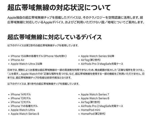 iPhone 15以降の各種モデル(iPhone 16eを除く)、iPhone Air、Apple Watch Ultra 2以降、Apple Watch Series 9以降、AirTag(第2世代)、AirPods Pro 3 MagSafe充電ケースは、第2世代の超広帯域無線チップを使用しているが、日本では、規制によりお客様は超広帯域無線の一部の周波数を利用できないため、検出範囲が拡大した「正確な場所を見つける」、「人を探す」、Apple Watchでの「正確な場所を見つける」など、超広帯域無線を使用する一部の機能は利用できないと説明しています。
