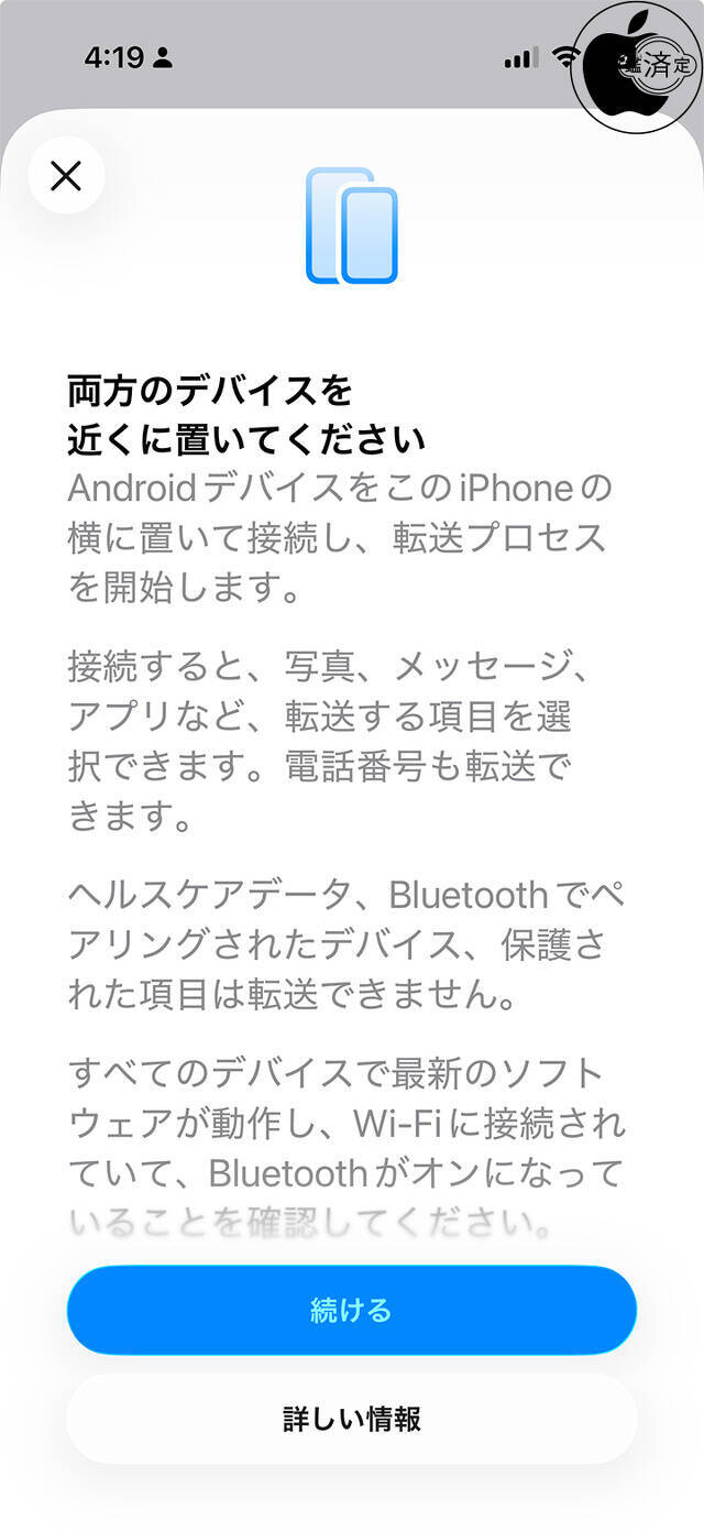 ヘルスケアデータ、Bluetoothでペアリングされたデバイス、保護された項目は転送できません。