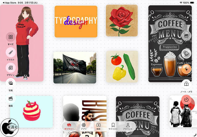ジャンルタブのギャラリーには、イラスト、デザイン、写真、動画といった目的に合わせたコンテンツが多数収録されています。