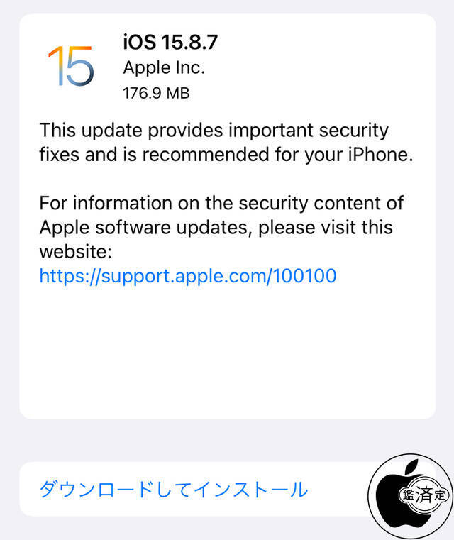 Appleが、iTunes経由または、iOSデバイスのソフトウェア・アップデート経由で「iOS 15.8.7 ソフトウェア・アップデート」の配布を開始しています。